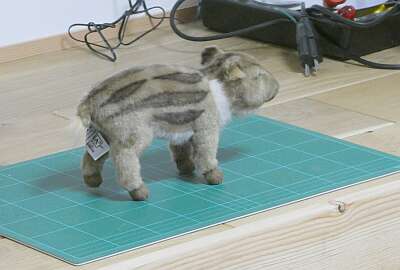 2.5mくらい先に置いた、ウリ坊ぬいぐるみをターゲットに威嚇している様子