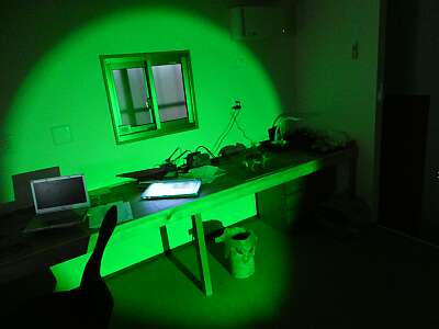 明るい室内ですが、LED投光でぼんやり緑っぽく見えています |