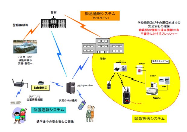| ●子どもたちの安全を担保するために 学校・地域で 子どもたちの安全のために、色々な取り組みが行われています その多くの取り組みの中のひとつとして、本システムのご利用をいただければ、学校およびその周辺の安全確保に貢献できるものと確信しております また、日頃の校内活動をスムーズにする役割を担ってくれる手段としてのメリットもご理解いただけると思いますし、災害時の緊急避難場所としての学校という場所の機能アップにも貢献できるものと考えています |