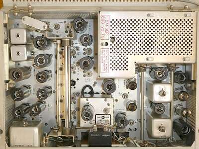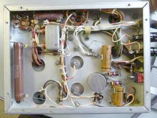 RFシールド・ケースに大きな穴が開けられています 大型のセラミック・トリマが見えています これが、7MHz帯に改造した痕跡です 各セクション毎に、スライドSWを取り付け、ピアノ線でつないで、フロントパネルから切替が出来るようにしてあります(押すか引くか) なかなかの力作ですが、OMの手で、オリジナルの13〜30MHzカバーに調整されて(戻されて)いました |
