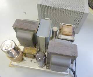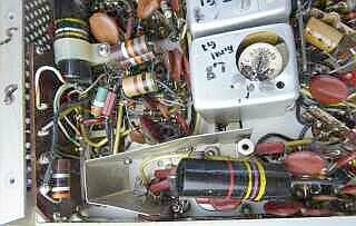 | 516F-1 左写真は上カバーを外した状態、右写真はシャーシ下を撮しています 高圧平滑コンデンサは、オイルコンデンサ、整流は、もちろん真空管で、チョーク・インプットです バイアス電圧の整流のみ、ダイオードが採用されています(シャーシに固定/一見、セレン整流器みたい) |