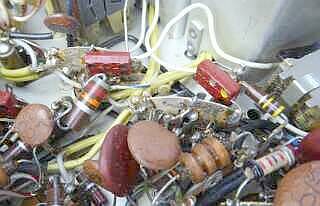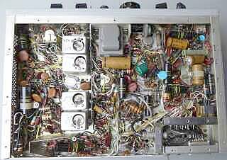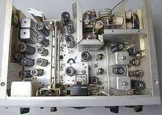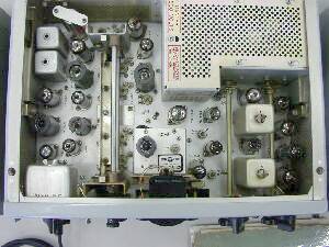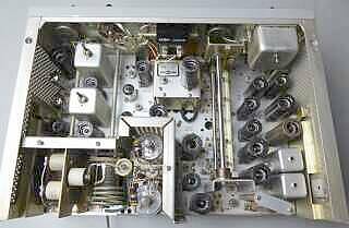 さすが、金属部はアルミでとても綺麗、それも硬質・高品位なアルミニウムで、シャーシからケースに至るまで全て Collins十八番のPTOが中央に見えます そして、同じくお得意のスラグチューン機構が、その左手に見えます 左下のアルミBOXは、水晶切替ユニットで、ここに装着した水晶で使用バンドが決まります 3.1Khzメカフィルは、左上のIFTの右上、楕円状の板で押さえられています(9PのMTソケットに装着) KWM-2では、ファイナルケースに収まっているドライブ段6CL6は、本機ではケースの外(PTOの上、シールドケース入り)に配置されています |