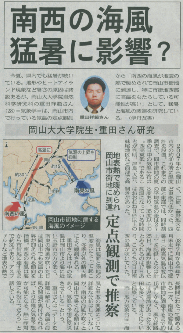 帰岡して、地元紙を読むと12日連続の『真夏日(熱帯夜)』とのこと 四国(高知)も、この夏のこと、もちろん暑いですが、そこまでは暑くありませんでした 最高気温は、32〜3℃程度で、熱帯夜でもありません 太平洋から吹いてくる風が意外と涼しい! 同じ南風でも、瀬戸内海から吹いてくる風とは明らかに差があります これは元の海水温だけの違いか、それとも途中のルートによる違い(途中で暖められる/ヒートアイランド現象)か・・・ 地元紙(山陽新聞 2010年8月23日朝刊全県版)に、地元大学院生による研究が発表されていました Davis気象観測装置をご利用いただいている方です この方の研究によれば、風の道(ルート)による違いだと推察されています ![]() Davis気象観測装置を大量にご利用いただいたプロジェクト・・・国交省国土技術政策総合研究所 鍵屋先生グループの『風の道』プロジェクトを思い出します ヒートアイランド現象の緩和に向けて、東京湾から吹く南風を、いかに関東平野奥まで届けるか・・・河川を中心とした『風の道』の確保に都市計画を見直すというものでした 毎年恒例の福山ツアー(市立全小学校に導入いただいた緊急放送システムの定期点検作業)と今回の2回にわたる四国ツアー・・・今年は例年になく、スポーツ飲料のお世話になりました!(異常に暑い夏です!) |