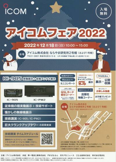 | 先にお知らせしたアイコムフェア2022 500人を超える来場者があって盛況であったそうです 当地岡山で開催予定のある新製品 IC−905 の紹介を目玉とするイベント 当初の1月の予定は延期され、3月第一週日曜日の開催になりそうです 確定すれば改めてこちらでお知らせいたします |