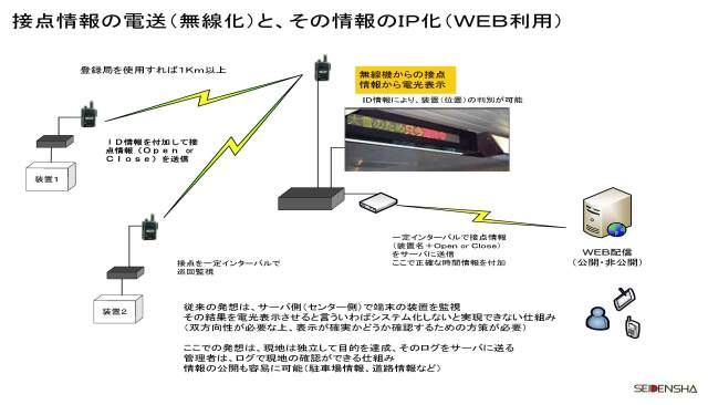 | 何をするもの、させるもの!? 複数の接点情報(Open,Close)を遠くまで届けるものです 簡易な特小では飛ばない、IP化を意識して無線LANを使おうとしても飛ばない(見通し外)など 意外とニーズはあっても実現が困難なケースが多い用途を実現させる可能性を持ちます 1.道路、あるいは河川情報の伝達、表示 2.シーケンサの一部の無線化 3.駐車場など稼働表示(サイネージ) ・複数箇所の情報を一元で管理、活用したいケース ・情報をリレーして活用したいケース ・同じ情報を、複数箇所で利用したいケース 電波の飛ぶ範囲での利用であれば、携帯網を利用するケースに発生するコスト/月額使用料は不要で、ランニングコストのかからない仕組みの構築が可能です(電波利用料は発生します) 携帯網利用に制限かかかるケースの発生などに対しても、影響を受けない独自インフラというメリットがあります(災害発生時などの利用に対して、安心の要素) 単純なリモコン(接点ON情報送信)とは異なり 1.一定インターバルで接点状態を確認して、その状態を送信 2.発信元がどこであるかが分かる「ID」情報を付加して送信 今回作成したものは、 1分インターバルで、接点状態を監視、結果を送信します IDの管理は、2bit 4箇所(4台)の無線機(装置)を受信機1台で管理します |