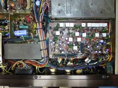この写真では分かりませんが、ファイナル管の下側のシールド板には穴が多数開けられていて、ドライバ管の放熱・・・空冷ファンによる空気の流れがドライバ管をも巻き込むように設計されています(終段部シールド板の他部分は、密閉されるような構造です)
