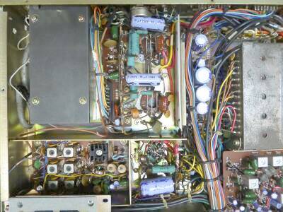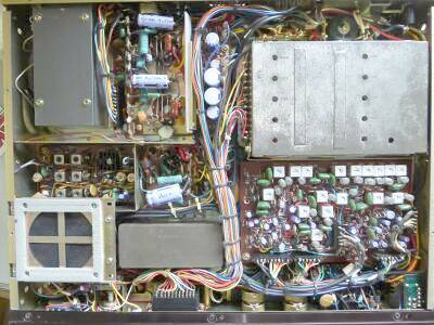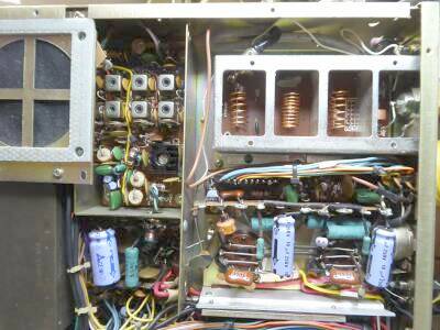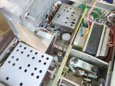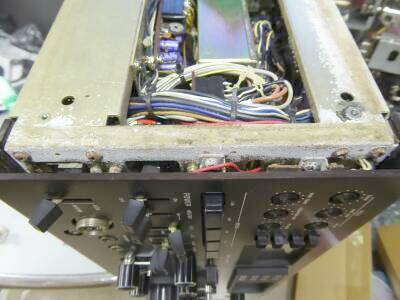 左写真は、諦めた時点でのスナップで、右サイドから分解中のRFユニットを写したもの、右のシールドは終段部です