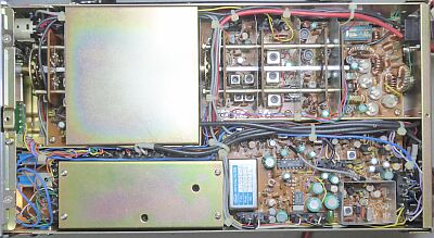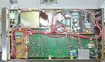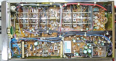 ケース内部 底面 上のシールド部は、OSC/コンバート、RFミキサー その右は、RF部で右端は送信ファイナル・フィルター部 下のシールド部は、PLL部 その右は、SSBジェネレータ/IF部です 中央に9MHzクリスタルフィルタが見えます |