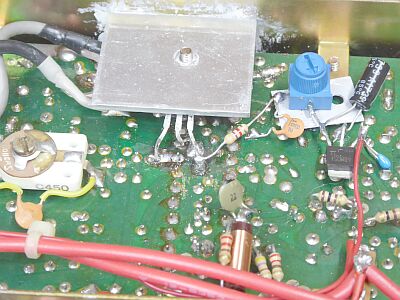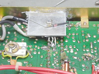 こちらが、中華製2SC1945を使用して実験中の様子 放熱用アルミ板の上に見えているダイオードは、ベースバイアス用のもの オリジナルでは、このアルミ板の下側、すなわちTRの上に取りついていました エミッタとコレクタを入れ替え、かつフィンを絶縁ということから配置を変えたものです 実際の出力は、各バンド3〜4.5W程度 |