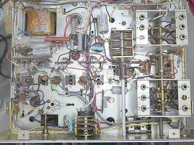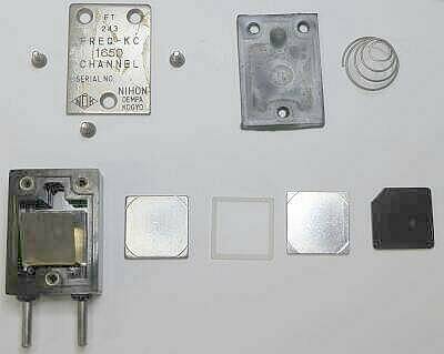 中央に見えるクリスタルが、この受信機のIF帯域幅を決める1片式のクリスタルフィルタ/1650KHzの水晶片です