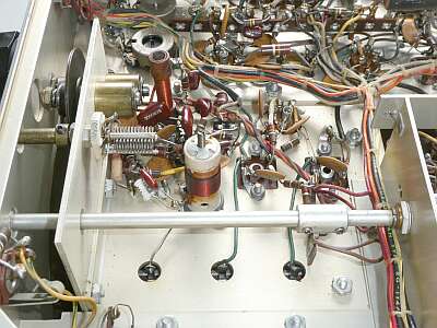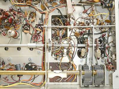 RF−1stMIX/OSC部です VFOのすぐ後ろに配されています 各コイルは、シールドケースに収めて、シャーシ上面に置かれています RFチューニングは、バーニア機構で減速されています |
