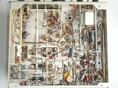 4.85MHz−4.35MHzを発振するVFO部 ご覧のように、VCはむき出しです 下側もお見せしますが、こちらも発振コイルはむき出しです 3連VCですが、VFOには一番奥のローター部を使用 上に見えるトリマはトランキング用 手前の二つのローター部は、1stIFの同調用です サブシャーシに乗っているのはマーカーです 100KHzクリスタル・・・GTベースです |