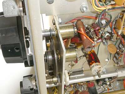 メイン・ダイヤルの減速機構 Collins、あるいはHeath-Kit同様のフリクション・ドライブです メインダイヤル1回転当たり、おおよそ11KHzです(9回転でおおよそ100KHz) ダイヤル補正用の小容量VCが見えます 直接VFOの周波数を変化させます |