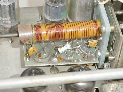 シールドカバーを取り外して写したもの コイルと基板の間を結んだ錫メッキ線の一本が、スルーホール抜けのようになって接触不良を起こしていました 怪しそうなところも含めて半田付けをし直しました ここまで分解したなら「RIT」を組み込もうかとも思ったのですが、本機で実運用することはないとの判断で止めました |