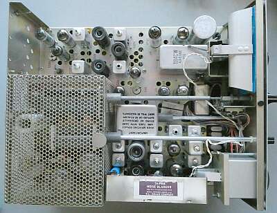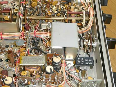 型式のCwゆえに、CWフィルタを内臓 その様子です 縦に2本装着されているUSB/LSBフィルタの後ろに、横向きに500Hzフィルタが追加されています 手前の8P角型コネクタは、外部VFO(RV-4C)接続コネクタで、Drakeでは、下向きに用意されています MIC端子やVOX関係ツマミなどはサイドパネルですし、小型化の工夫がいろいろなされているようです |