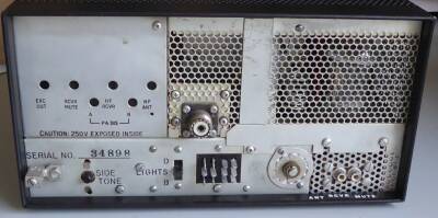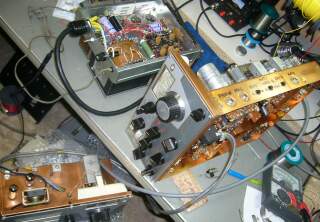 本体だけ譲り受けました、相当に古いものですが、保管状態は悪くありません 真空管の構成やメインノブの形状から、初期モデルではないようです もちろん、すぐに動作するなどとは思っていません 電源は、いつかこんな役立つ日も来るであろう?と入手していたYAESU FP−200で対応しました ヒーターは、6.5V 6Aが2巻線、高圧も整流出力電圧が、300V、600V、800Vとトランス・タップで選択でき、中圧は300V、そして低圧は、中圧の1/2の150Vと言う内容で、スピーカーを内蔵しています(今回は、スピーカー未使用) 今回は、高圧600Vで使用しますが、中圧300Vは高すぎですので、ブリーダー抵抗を入れて250Vを得ました(さすがに150Vでは、ゲイン不足が顕著) あと、送信ファイナル管のバイアス調整VRを組み入れました 左写真は、本体に電源、そして外部VFOといずれもお腹を見せる形で取組中の様子です |