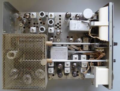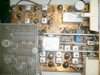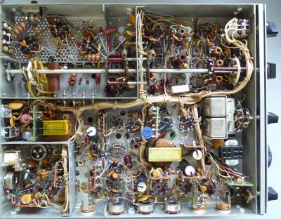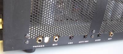 こちらは、シャーシ上面です 青く見えるのは、2つのクリスタル・フィルタです 中央のアルミのケース(四角のもの)は、RF段間調整のVC部分です(スラグ・チューンではありません) 余談ですが、MICプラグは、Collisと一緒の一回り細い3Pプラグと思いきや、通常のサイズです |