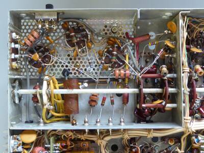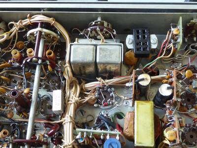 こちらは、シャーシ下面です 配線&半田付けは、きちっと行われています このあたりは流石です 上部左が、ファイナル部(ソケット3個が見えます) その上に、交換したスライドSW(受信アンテナ選択)が見えます クリスタルフィルタの下に見える角形コネクタが、外部VFO接続コネクタです 差し込むだけで、認識した動作をします、良くできてます ドレークお馴染みの銅板ぽく見えるシャーシですが、磁石がくっつきます(メッキです!) |