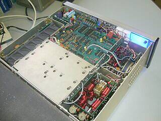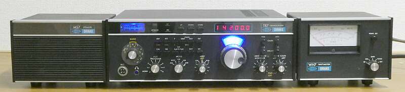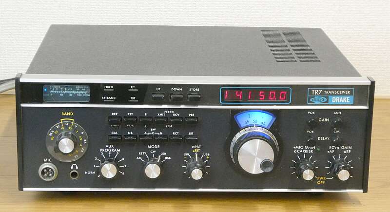 | 最近では当たり前になっていますが(もっとも昨今は、DSP処理の普及などにより、ダウンコンバージョンが見直されているようにも思いますが)、中間周波数を一度高い周波数に持ち上げてから処理する、いわゆるアップコンバージョン・タイプとしては、きっとアマチュア無線機器としては最初のものだったと思います(確か1977年の発売) 1.5MHz〜30MHz帯をカバーし、USB、LSB、CW、RTTY、AMの運用(ゼネカバ受信とアマチュアバンドにおいて、SSB/CW最大入力250Wの送信)が出来ます(拡張ボード/オプションでMARS・WARC対応も可能) 48MHzという第一中間周波数をもち、QRM対策としてパスバンドチューニングの機能を内蔵します また、DBMを多用し、トップミキサ(RF増幅なし)の採用ということで設計され、また送信部も全てトランジスタ化された、当時としては最新の技術を搭載した無線機と言えます 構造については、4シリーズとは異なり、硬質アルミのシャーシ・ケースが採用され、プリント基板もエポキシの両面基板が採用されています コンパクトな作りというのは、4シリーズと同じDrakeのDNAです 小型軽量の本体ですが、純正電源のPS−7は、アホくらい重いです(いえ、しっかりしたものです) |