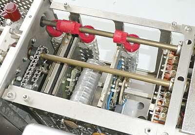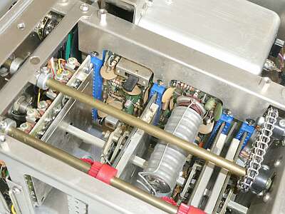 RF系のチューンは、ご覧のようにベベルギアを使って90度ひねってVCが用意されています 左から ドライバ・コイル アンテナ・コイル ミキサー・コイル です チェーンは、終段のLOAD調整VC駆動用です 中軸は、PLATE調整VC駆動用です(同軸構造) |