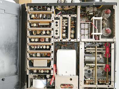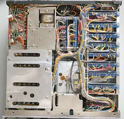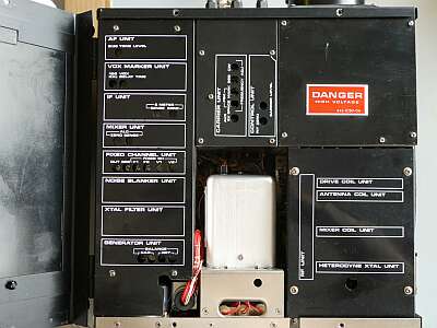 シャーシ上面 各カバーを取り外して写しています ご覧のように、ユニット化されています 海外モデルは一般に、フルオプションのケースが多いのですが、本機のCWフィルタについては、国内D/X同様にオプション扱いです(「S」には標準実装) YJ-3395Cで、YG-3395Cではありません |