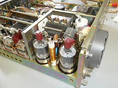 上蓋を外した様子 角度を変えて ファイナル部シールドを取り外してファイナル部を中心に写しています ファイナル管は、6146Bです(S2001ではありません) |
