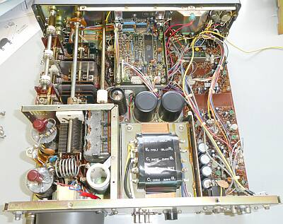 上蓋を外した様子 高圧の平滑コンデンサと並んで、ドライバ管12BY7Aが見えます このドライバとファイナルのみ真空管で、あとは全て半導体構成です |