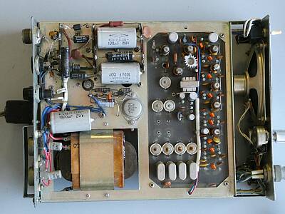 こちらは、Marker 66の内部です 受信基板と送信終段が見えます ハイブリッド構成で、終段は真空管6360です 受信のフィルタは、東光の24KHz巾のメカニカルフィルタが採用されています(本式!) 送信基板が見えているほうのリア側は電源部です 改造・欠品は無さそうなのですが、電源が入りません リア側の状態が悪く(保存状態が良くない)、標準の2Aのヒューズでは飛んでしまいます 試しに5Aのヒューズを入れたところ巻き線抵抗から発煙・・・ 基板は、ガラスエポキシ風で劣化は見られないのですが残念! トランスがNGかな・・・です 回路図が入手できれば、もう少し手の入れようがあると思います |