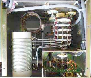 真空管収納部の下側です 直熱管を使ったGGアンプですので、フィラメント回路にはフェライトコアを使ったRFCが用意されています 電源ON 即送信で出来る(余りしない方が良いかも)直熱管の採用は魅力があります 場合によっては(傍熱管の場合)、例えばここで90秒待たされるのは、シーンよってはイラッとすることでしょう 最近の半導体アンプは、この手のことで言えば最先端です(バンド切替も楽だし・・・) 3000V前後の高圧を掛ける真空管アンプの時代は、もう終わったのかなと正直思います |