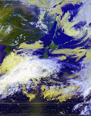 | 調整中に受信したNOAA15の画像 東シナ海上空からでしょうか(2005-12-29 22:00 UTC) | ||||||||||||||||||||||||