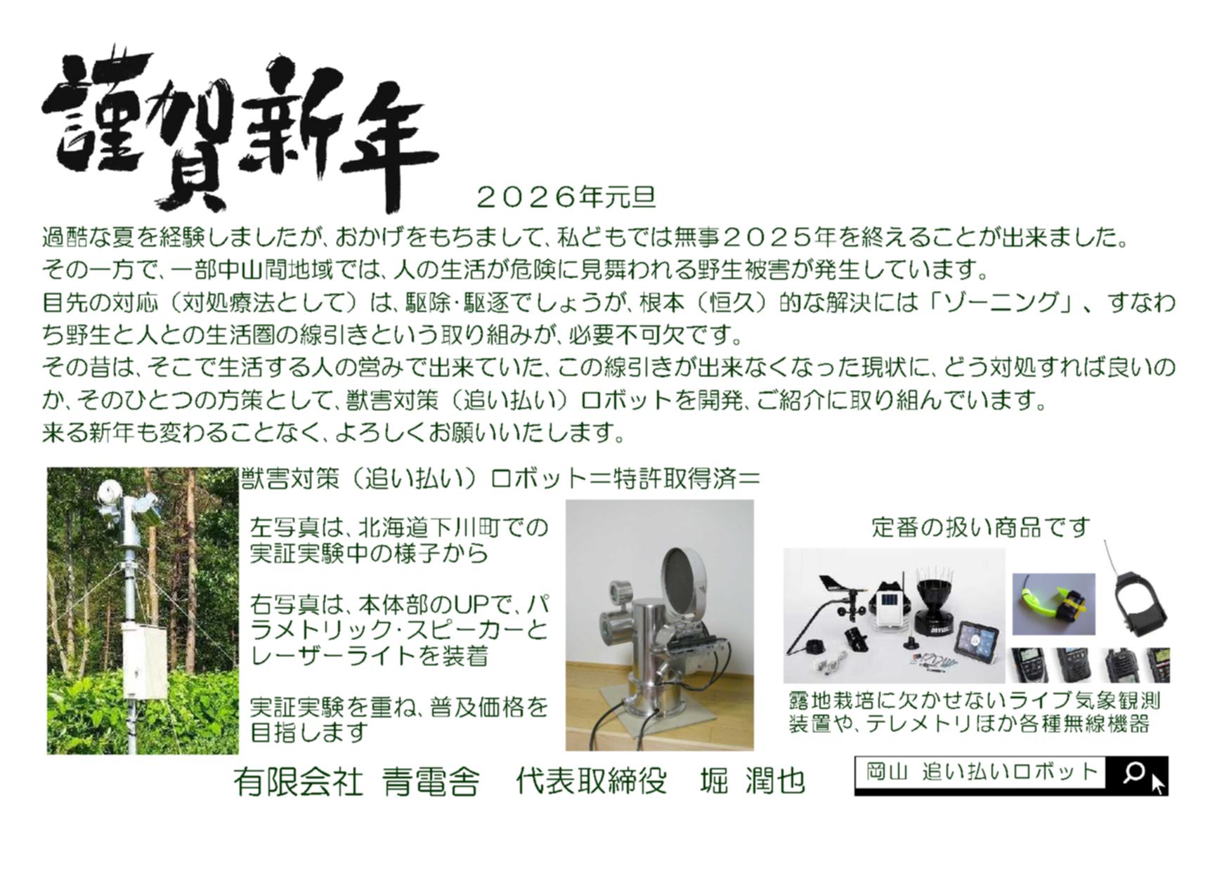 | 新年を迎えるにあたって、ご挨拶を申し上げます 本年も 獣害対策、あるいは露地栽培農家の働き方改革に向けたシステムづくりなど、少しでも中山間地域のお役に立てるよう、できる努力を続けますのでよろしくお願いいたします |