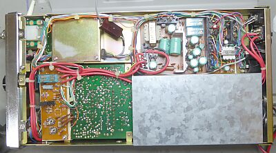 ケース内部 底面 上のシールド部は、OSC/コンバート、RFミキサー その右は、RF部で右端は送信ファイナル・フィルター部 下のシールド部は、PLL部 その右は、SSBジェネレータ/IF部です 中央に9MHzクリスタルフィルタが見えます |