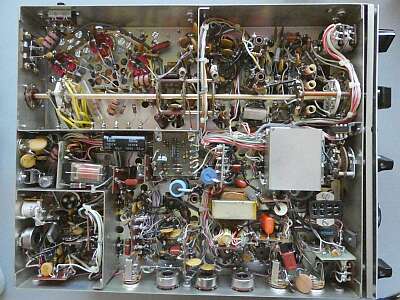 型式のCwゆえに、CWフィルタを内臓 その様子です 縦に2本装着されているUSB/LSBフィルタの後ろに、横向きに500Hzフィルタが追加されています 手前の8P角型コネクタは、外部VFO(RV-4C)接続コネクタで、Drakeでは、下向きに用意されています MIC端子やVOX関係ツマミなどはサイドパネルですし、小型化の工夫がいろいろなされているようです |